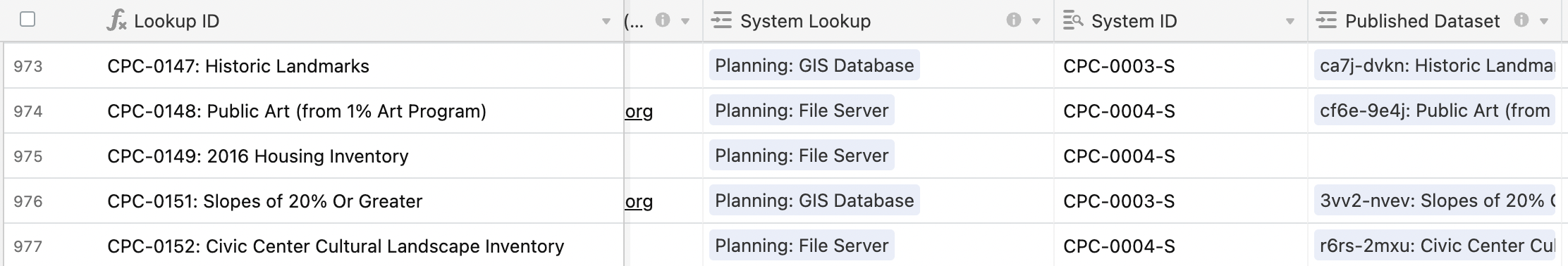 DataSF currently uses an Airtable base to keep track of all datasets which are candidates for publishing -- whether they are publicly available or not. This system allows us to tie datasets to their data system and track their priority and value.